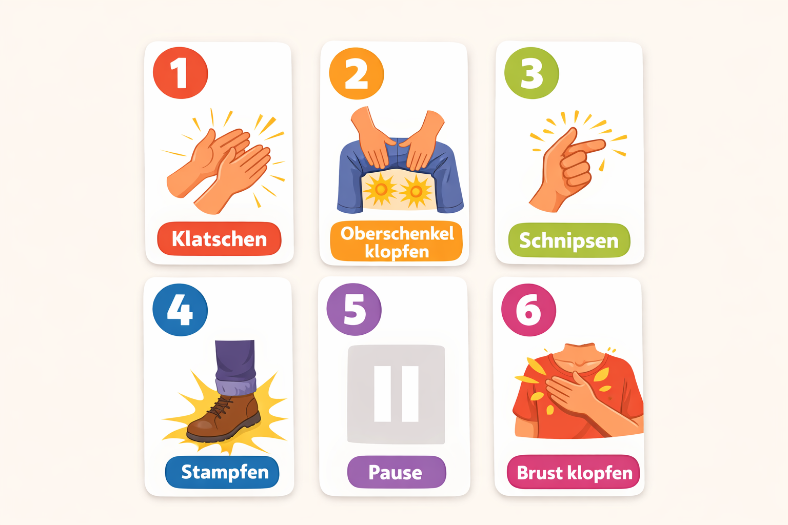 Beim Rhythmus-Würfeln würfelst du für jeden der vier Schläge eine Zahl, und jede Zahl sagt dir wie ein kleines Geheimzeichen, ob du klatschen, stampfen oder still sein sollst, sodass Schritt für Schritt ein spannender Rhythmus entsteht, den dein Körper wie ein Instrument erzählt.
