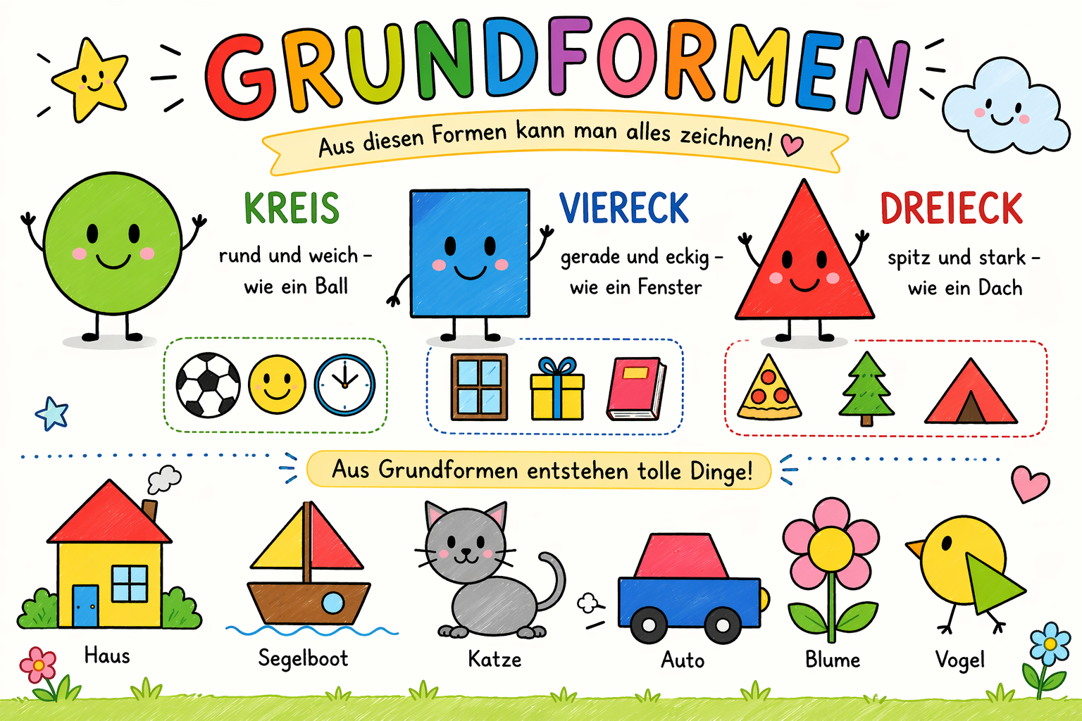 Grundformen sind einfache Formen wie Kreis, Viereck und Dreieck. Viele Dinge um dich herum bestehen daraus. Wenn du lernst, die Grundformen zu zeichnen, kann dein Gehirn Bilder besser verstehen und schneller einordnen – das hilft dir beim Denken und Lernen.